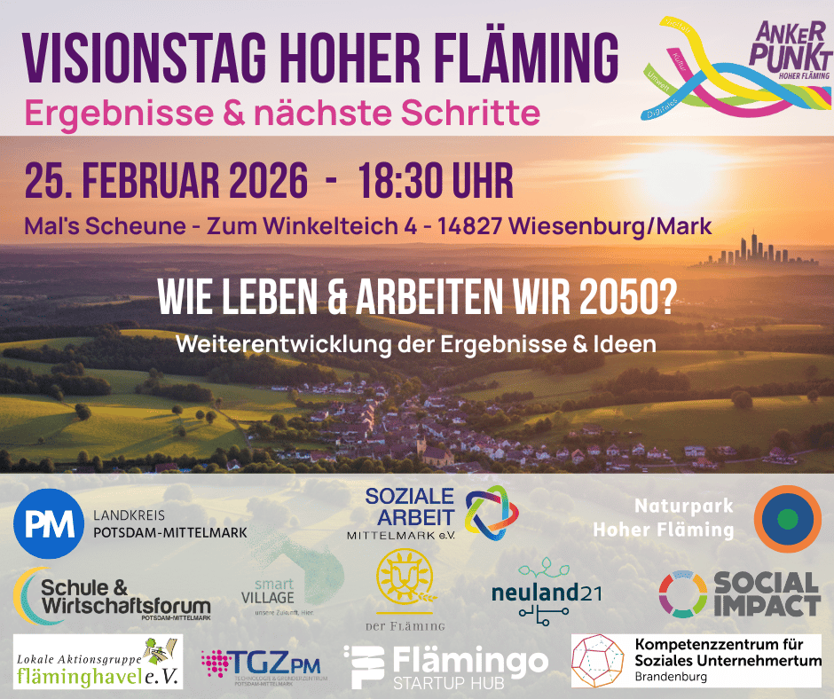 Ergebnisse und Schnittmengen: “Fläming Futures” Mit über 100 Anmeldungen und rund 80 Teilnehmenden aus Politik, Verwaltung, Unternehmen und Zivilgesellschaft war der Visionstag ein voller Erfolg […]